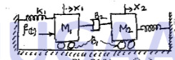 Construct mathematical model for the mechanical system shown in the following figure. Then draw electrical equivalent circuit based on F-V analogy.