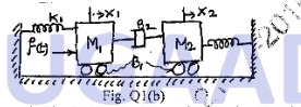 Construct mathematical model for the mechanical system shown in Fig. Q1(b) Then draw electrical equivalent circuit based on F-V analogy.