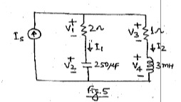 (a) In the circuit shown in Fig. 5, Is = cos 1000 t. Determine the frequency domain circuit and determine the phasors Iand 12. Draw the phasor diagram for V1, V2, V3 and V4 in the same figure.