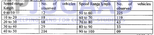 The following data were obtained from the spot speed studies carried out at stretch of highway during a certain period of time. Suggest 1) Speed limit for regulation of traffic. ii) Lower speed group causing congestion. iii) Speed for design of geometric elements.