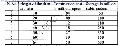 c. The construction costs for certain possible heights of a dam at a given site have been estimated and the storage capacity for all these dam heights are tabulated in the table below: