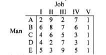 Five men are available to do five different jobs. From past records the time (in hrs) that each man takes to do each job is known and given in the following table;