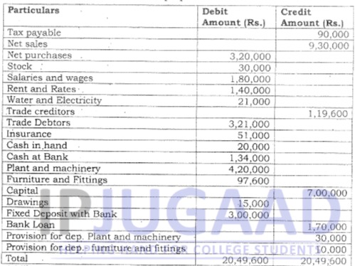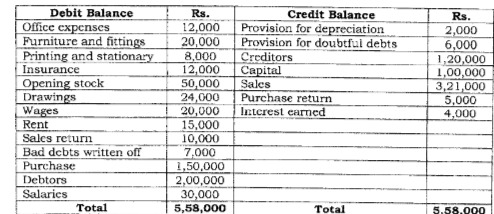 following adjustments i) Depreciate furniture and fittings by 10% on original cost. ii) Make a provision for doubtful debts equal to 5% of debtors. iii) Salaries for the month of March amounting to rs. 3,000 were unpaid which must be