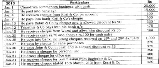 Jan 12 Cash Sales Rs. 20000/- Jan. 20 Cash Purchases Rs. 5000/- Jar. 31 Salaries paid Rs. 5000/-