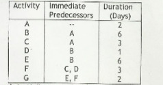 (i)Construct the project network (activity on arc type) (ii) Identify the critical path.(iii) Find the free and independent float for each activity and present in a table. (V) What is the effect of delaying activity D by three days?