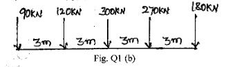 b. A train of Five wheel loads crosses a simple span of 30 meters. Calculate the maximum positive and negative shear at midspan and the absolute maximum bending moment anywhere in the span