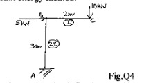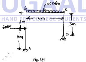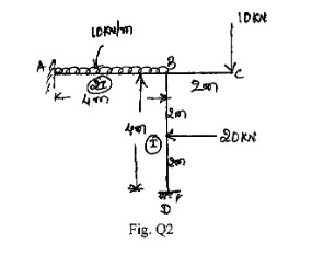 Determine horizontal and vertical component of deflection at point 'C' for the frame loaded as shown in Fig. Q4 by strain energy method.