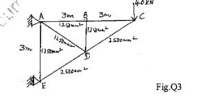 Find the vertical deflection at the joint for the pin jointed truss shown in Fig.Q3, by strain energy method. The cross sectional area is shown. Take E=200 kN/mm2.