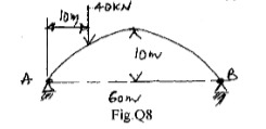 A three hinged parabolic arch is loaded as shown in Fig.5(b). Determine the reactions at supports, normal thrust, radial shear and bending moment at left quarter span point.